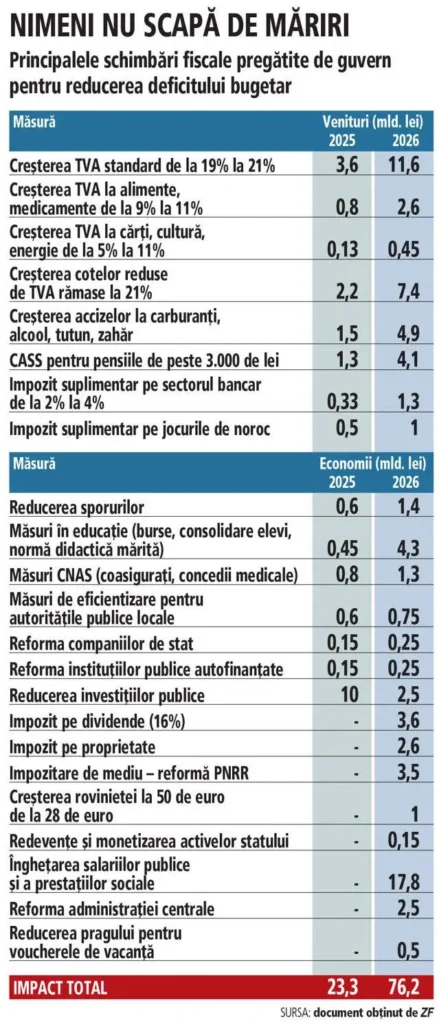 - Guvernul a anunțat că noile măsuri aprobate vor reduce cheltuielile bugetare cu aproximativ 19 miliarde de lei — echivalentul a ~1% din PIB. Forbes Romania